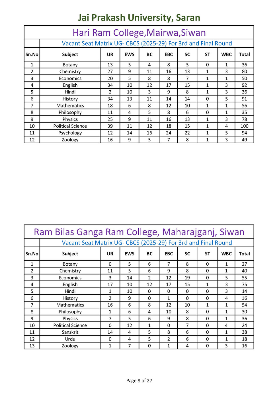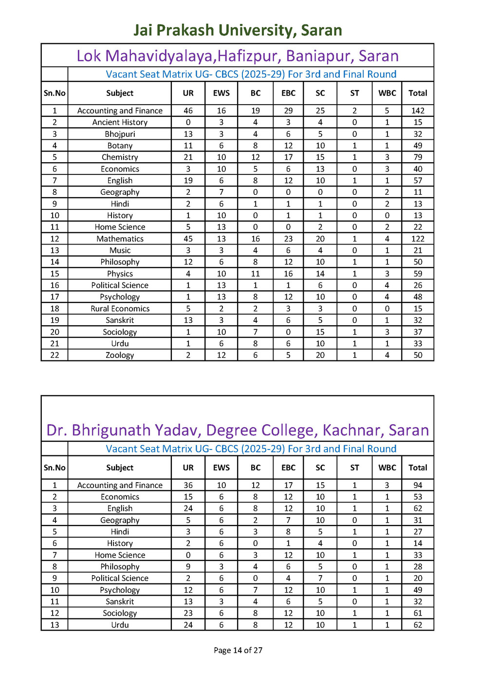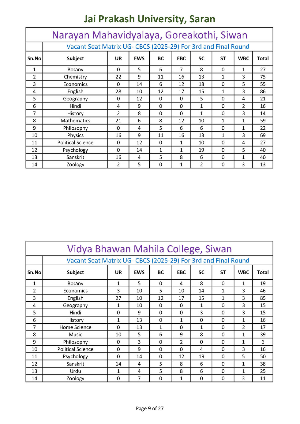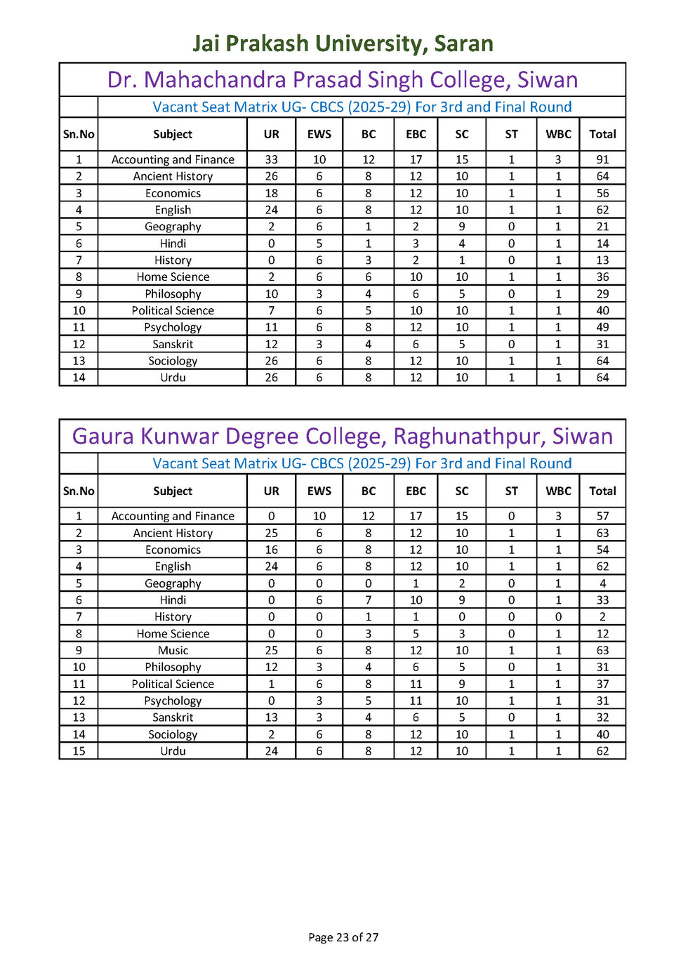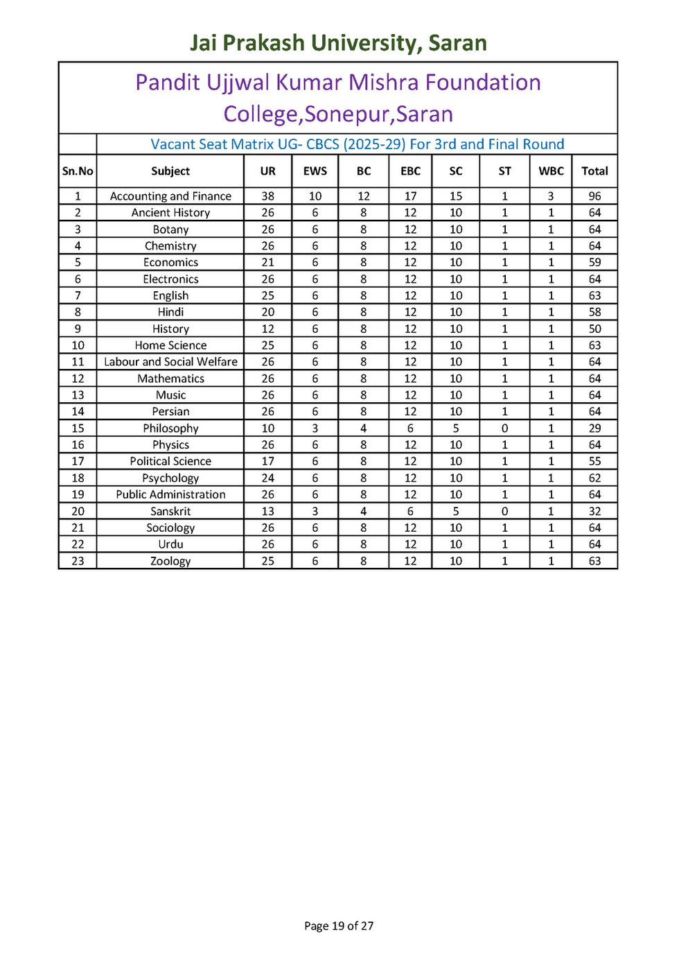 विषयवार रिक्त सीटों की स्थिति नीचे उपलब्ध करा दी गई है । अन्यर्थी उसे देख कर ही विषय एवं महाविद्यालय का चयन करें। इतिहास, राजनीति विज्ञान, हिन्दी, गृह विज्ञान, अर्थशास्त्र, भूगोल विषयों में अंगीभूत महाविद्यालयों में रिक्त सीटों की संख्या बहुत कम है। अतः अपना नामांकन सुनिश्वित करने के लिए अन्य विषयों का चयन करें।